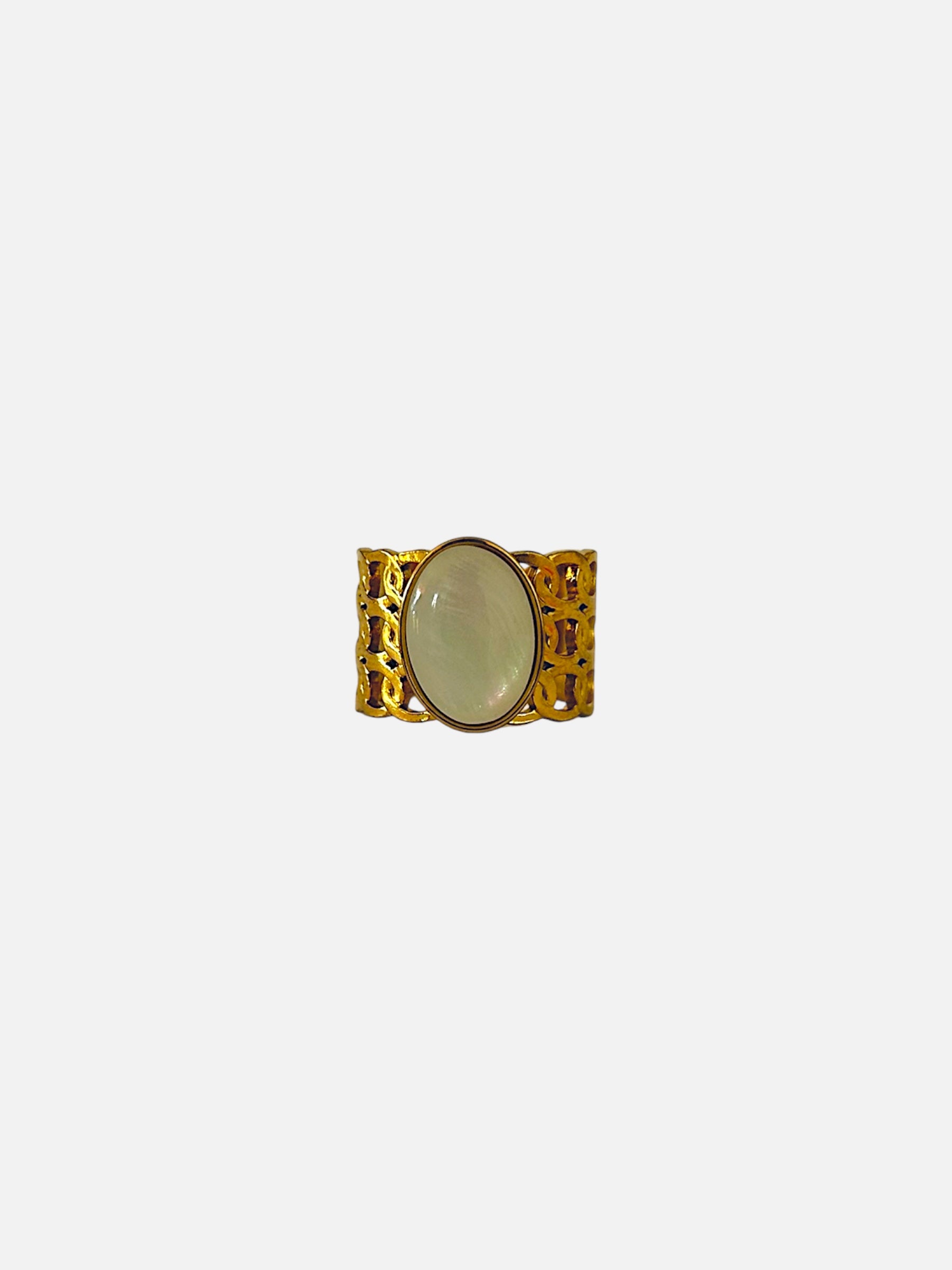 Design : Anneau large ajouré, orné d’une pierre ovale en relief
