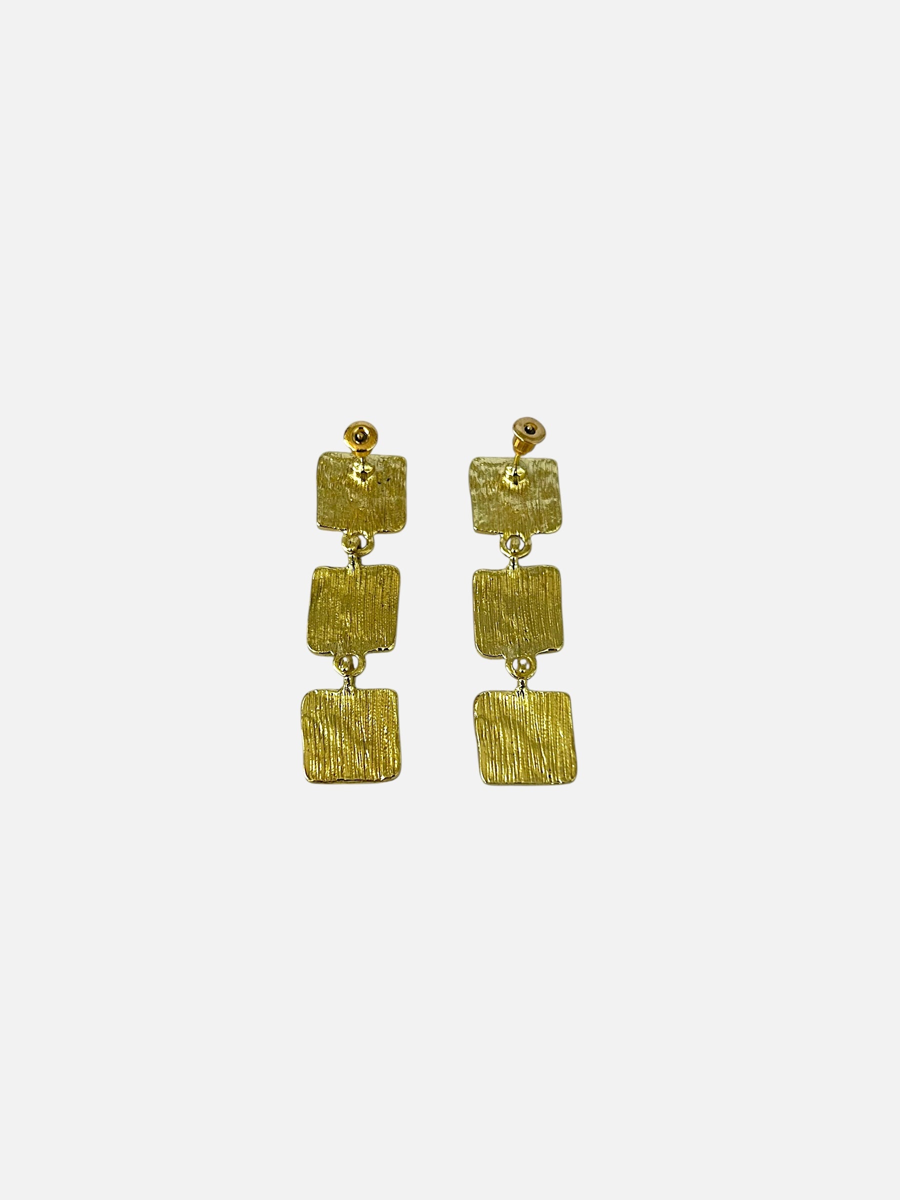 Les boucles d’oreilles "Carré d’Or" mêlent formes graphiques et textures artisanales pour un look chic et affirmé. Leurs trois carrés articulés créent du mouvement et captent la lumière à chaque geste. Une paire au style rétro-chic, parfaite pour rehausser une silhouette élégante ou donner du caractère à une tenue sobre.