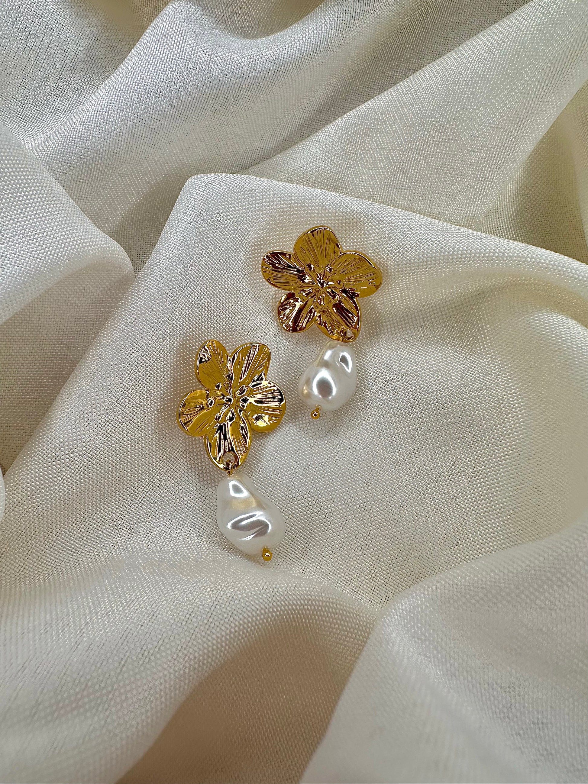 Les boucles d'oreilles "Fleur de Perle" capturent la beauté délicate d'une fleur dorée et l'élégance d'une perle suspendue, créant une harmonie parfaite entre nature et raffinement.