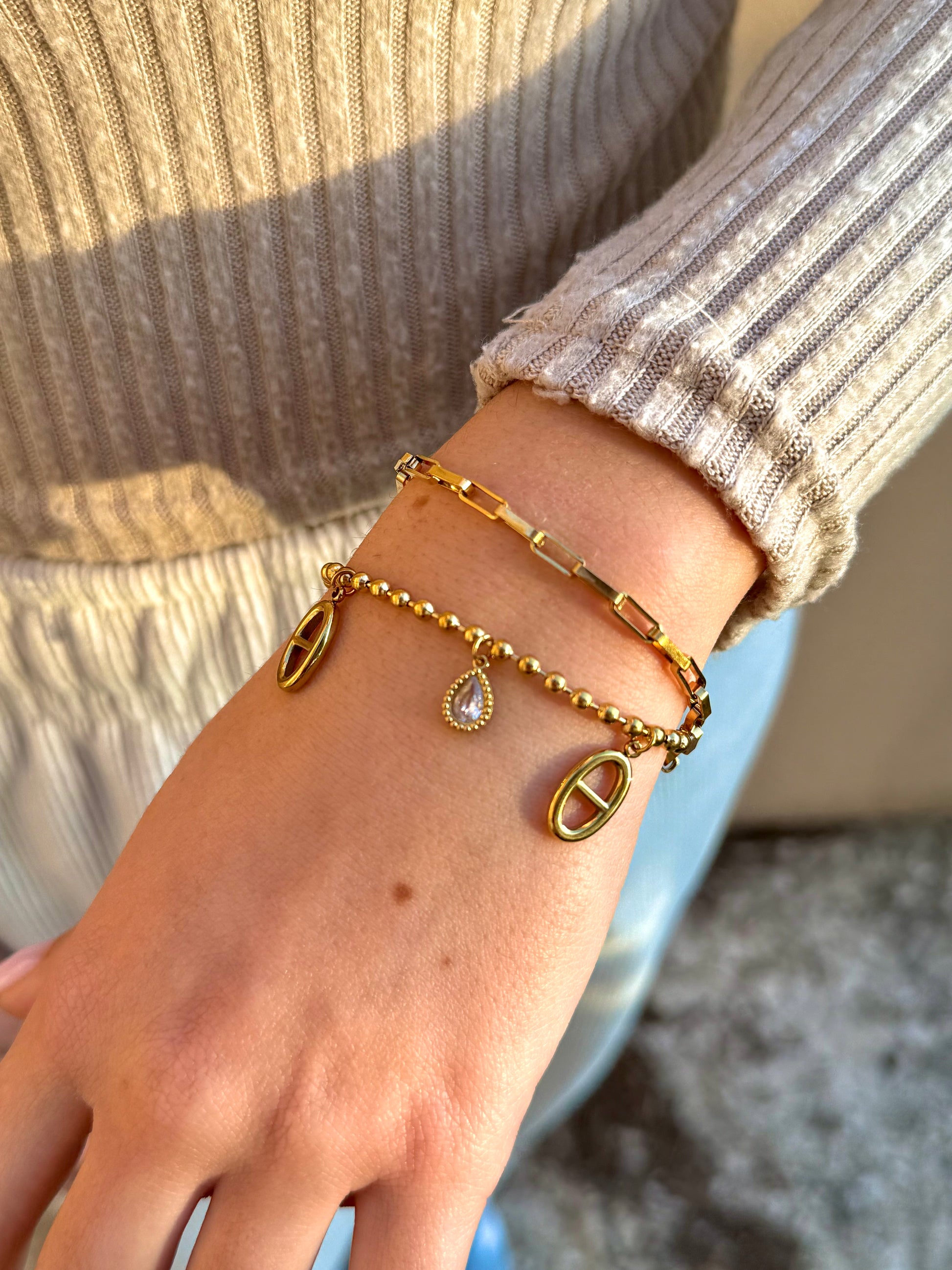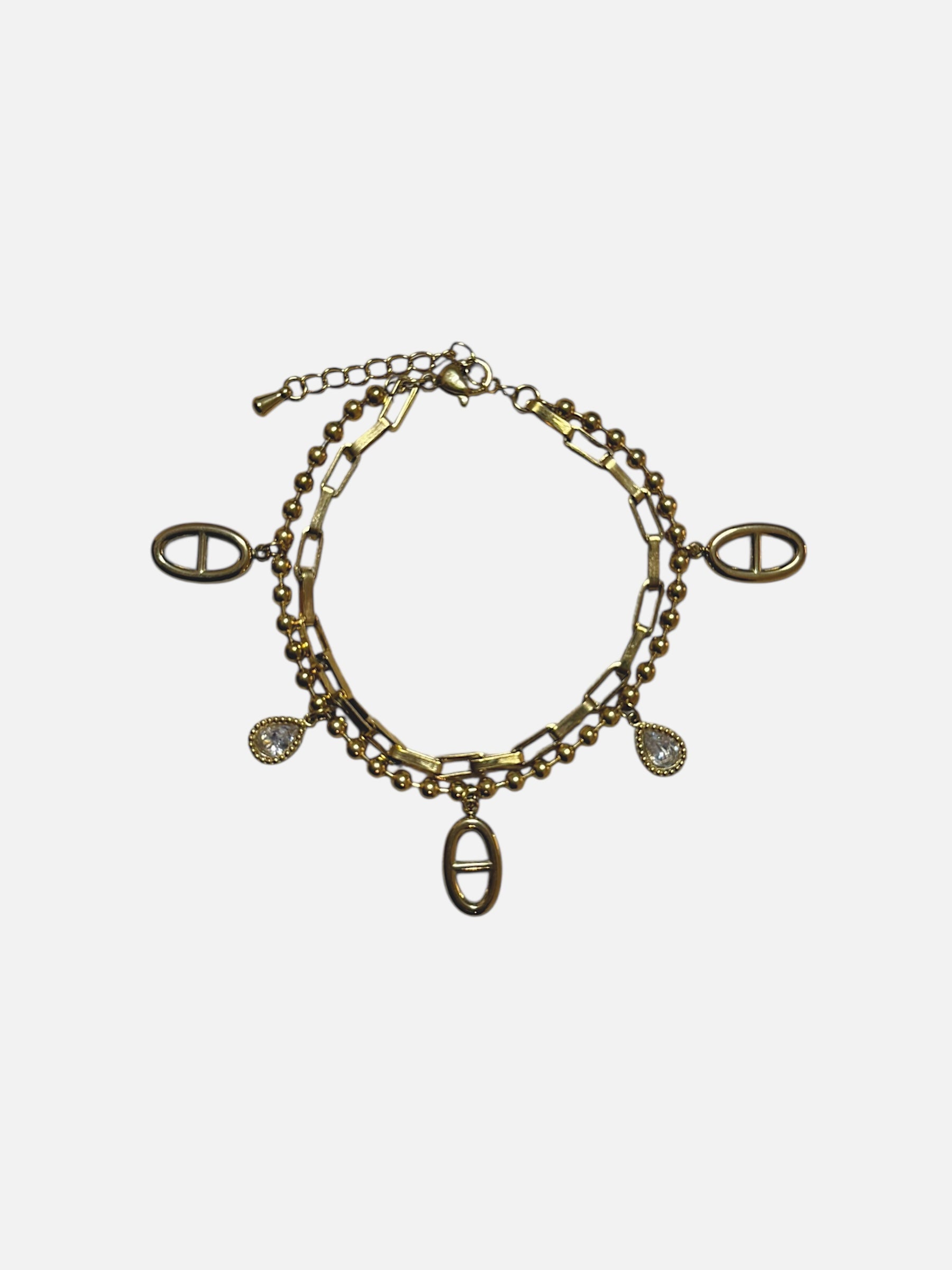Le bracelet Alaya mêle audace et sophistication dans un design unique à double rang. Composé d’une chaîne à billes dorées et d’une chaîne rectangulaire, il se distingue par ses pendentifs en forme d’ellipse graphique et ses gouttes serties de strass. Ce bijou est pensé pour illuminer votre poignet avec subtilité, tout en apportant une touche contemporaine assumée.