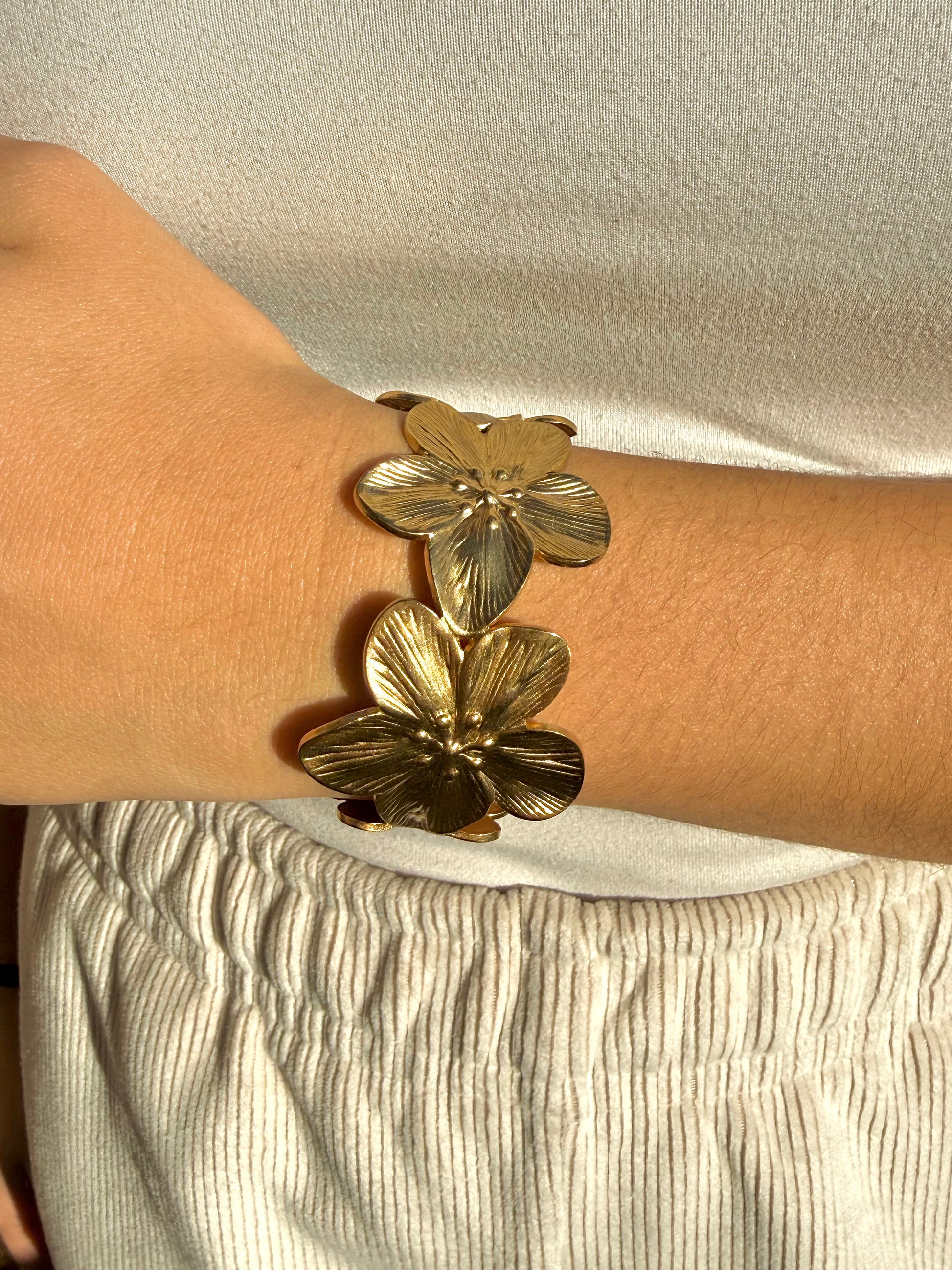 Le bracelet Althéa rend hommage à la poésie florale avec ses fleurs en relief finement ciselées. Son design ouvert et structuré épouse délicatement le poignet tout en offrant un éclat doré lumineux. C’est un bijou qui évoque la nature en pleine floraison, à la fois élégant et affirmé.