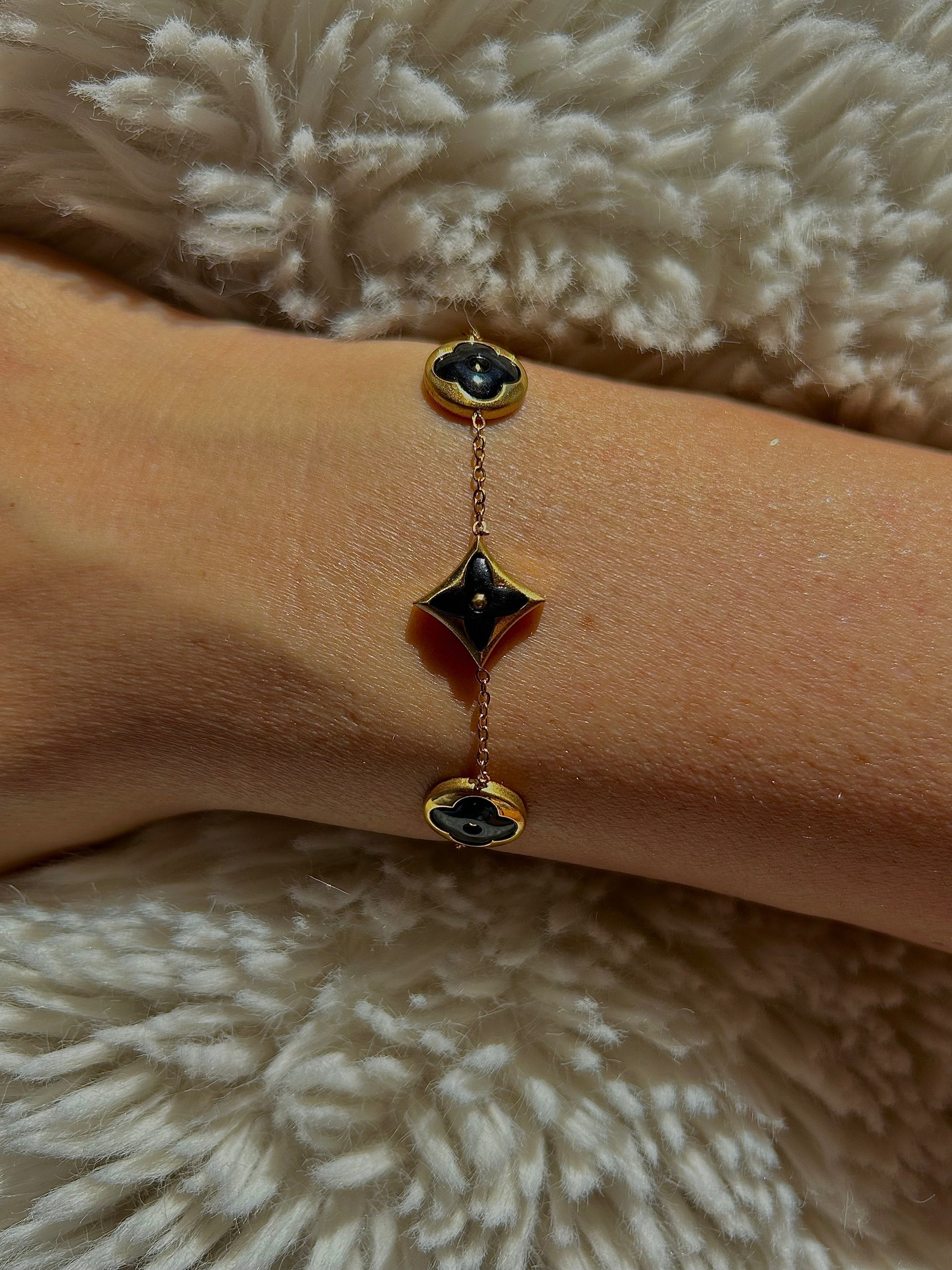 Le bracelet "Black Blossom" incarne l'élégance subtile et le chic intemporel. Conçu avec des breloques en forme de fleurs et de diamants noirs, il allie un design raffiné à des touches audacieuses. La finition dorée du bracelet contraste magnifiquement avec l'émail noir, créant ainsi une pièce qui ne passe pas inaperçue.