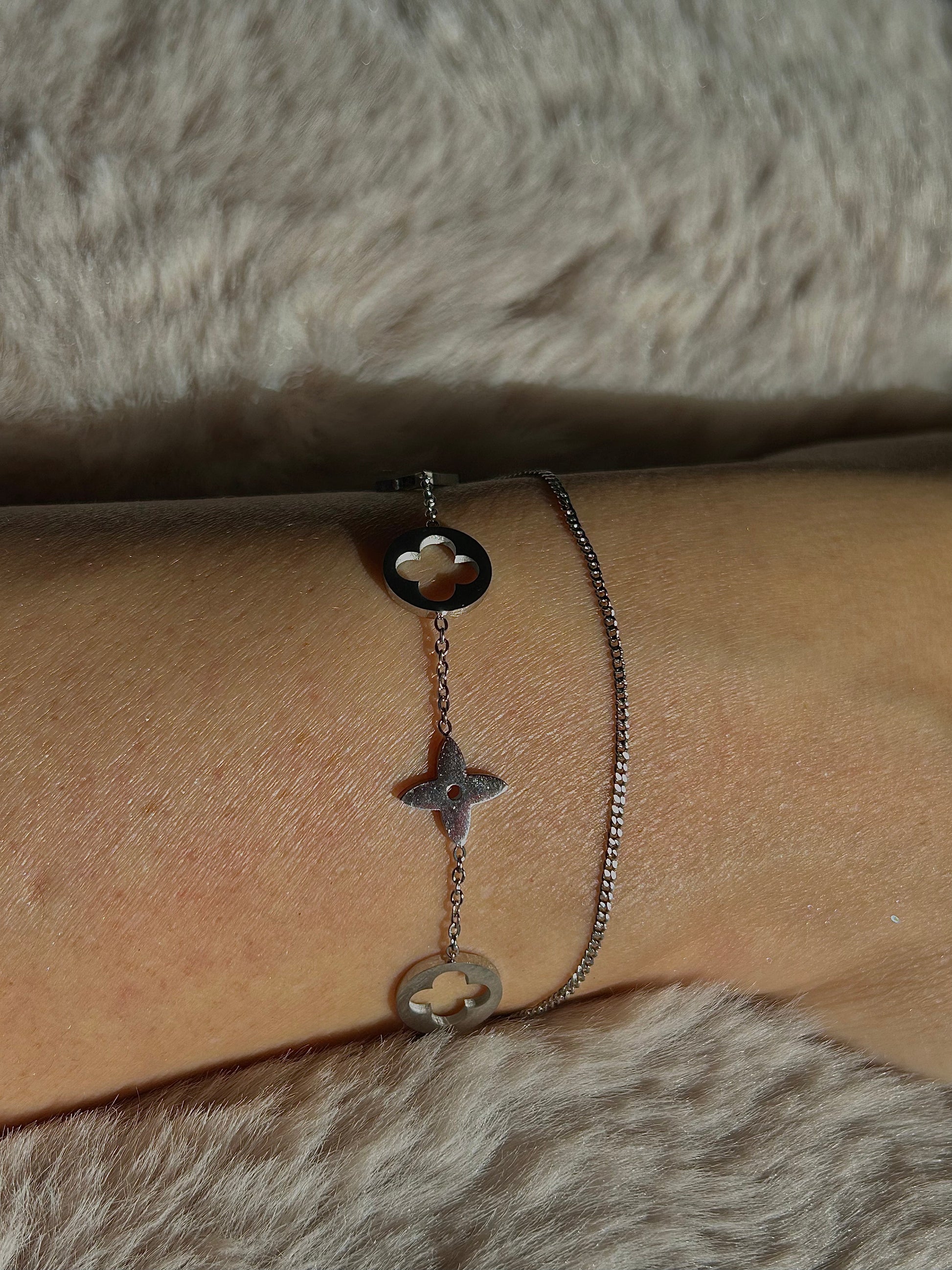 Le bracelet "Céleste Obsidienne" allie élégance et mystère avec ses charmes géométriques argentés et noirs, suspendus à une chaîne argentée fine. Chaque détail, du motif floral à l'étoile centrale, apporte une touche de modernité et de raffinement.