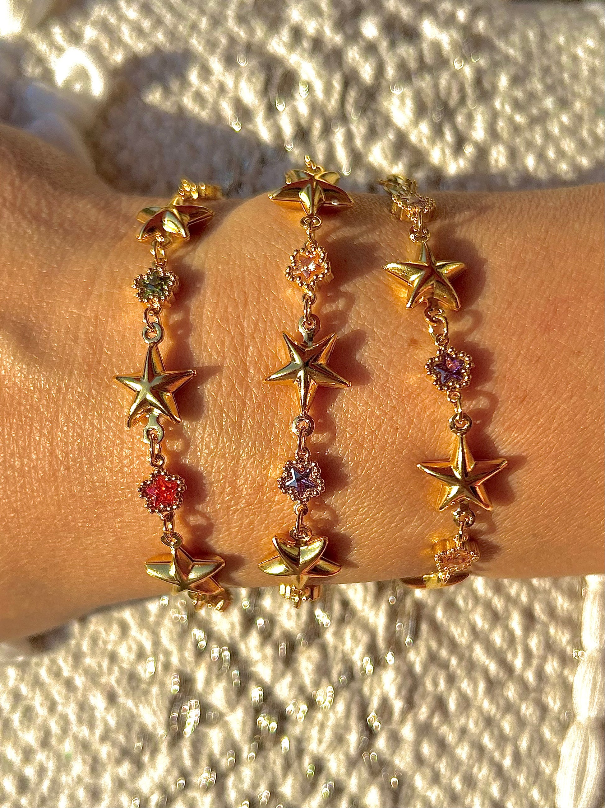 Laissez la magie des étoiles illuminer votre poignet avec le bracelet "Célestia", une création cosmique et scintillante. Composé d’étoiles dorées et de pierres multicolores, il évoque les constellations et les nuits d’été pleines de rêves.