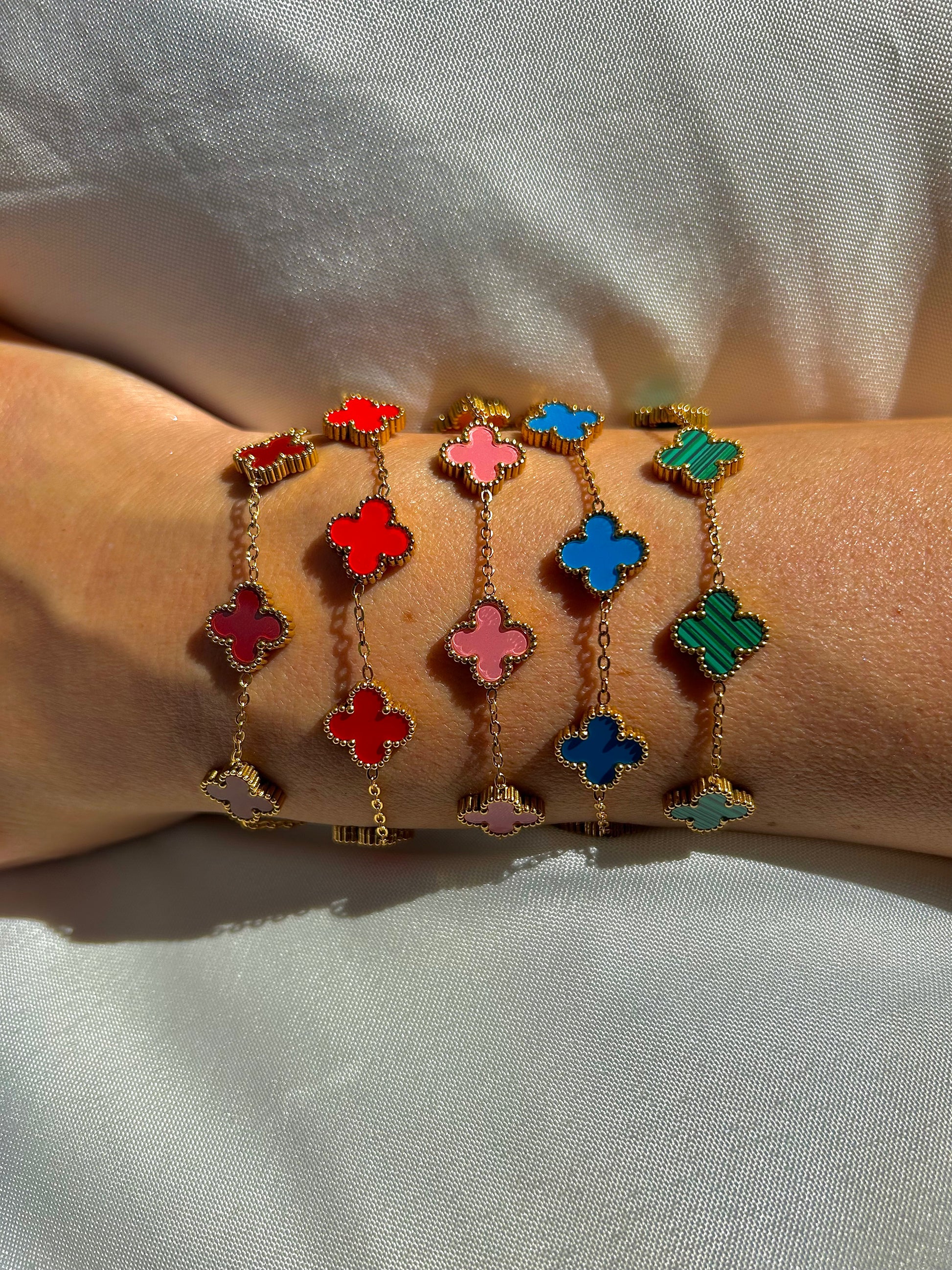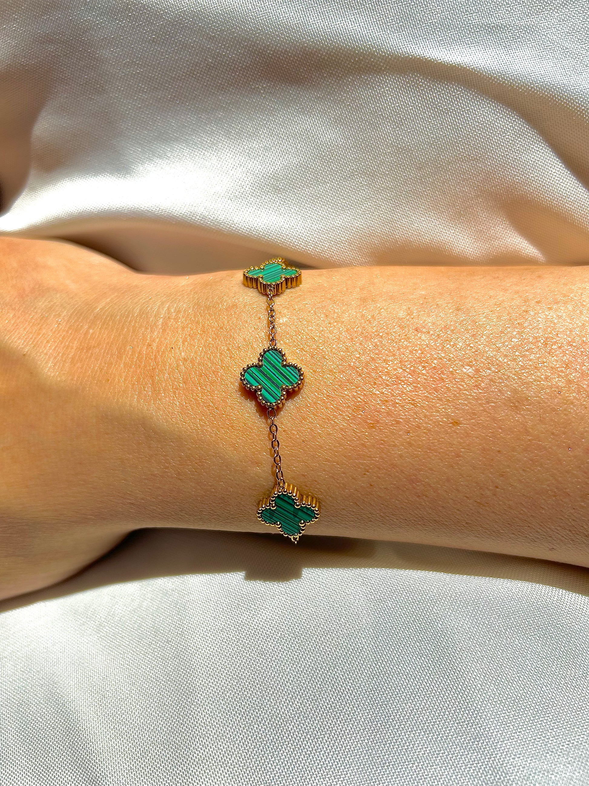 Le bracelet "Clovers Green" allie l'élégance intemporelle du doré à la modernité des fleurs vertes rayées. Ses motifs géométriques et sa chaîne délicate apportent une touche raffinée à chaque tenue.
