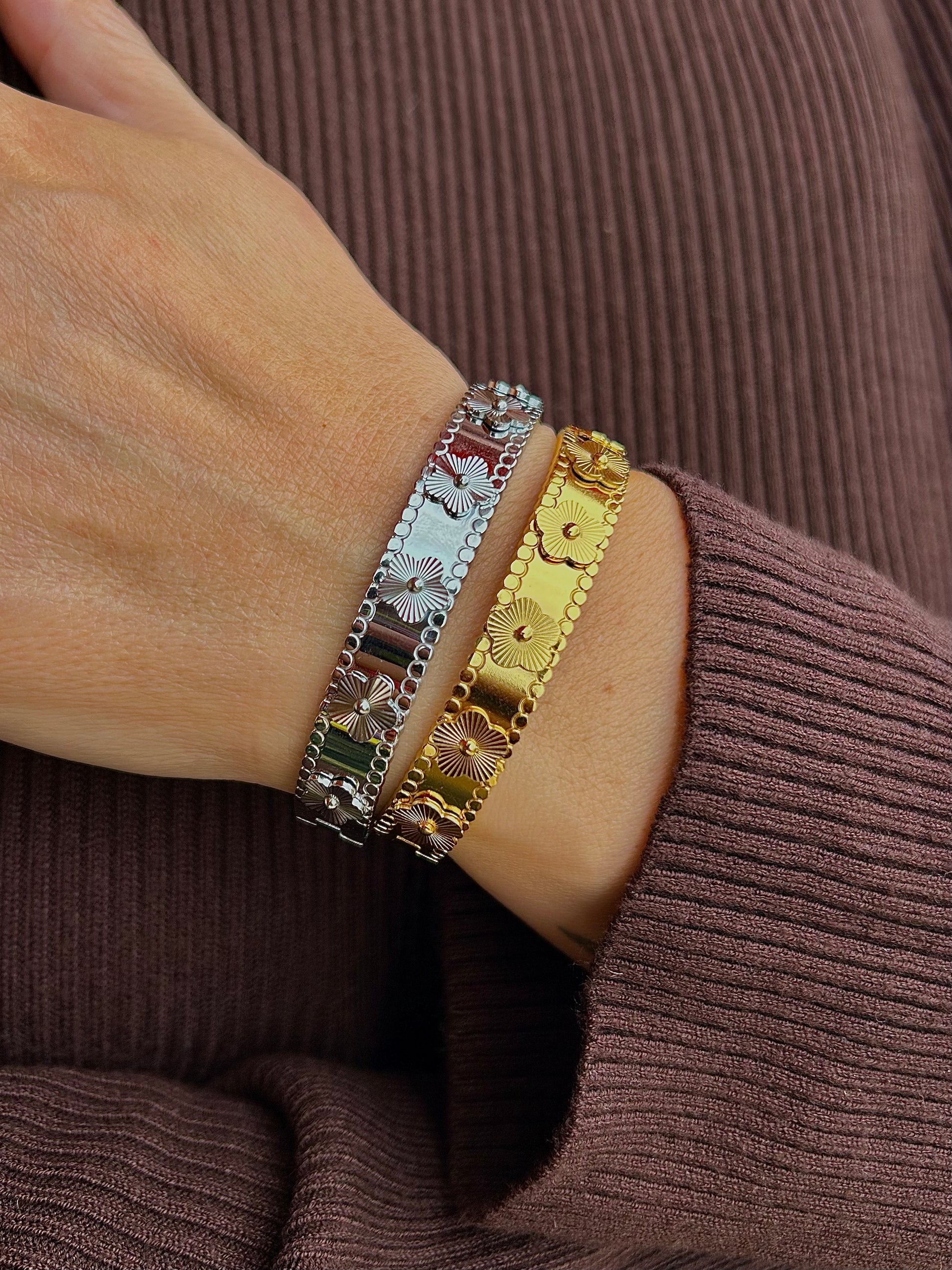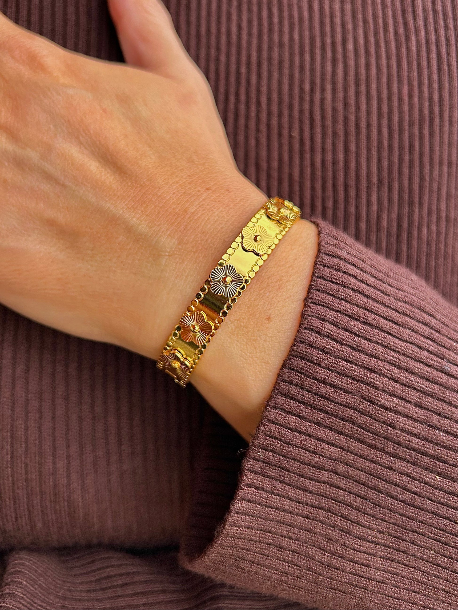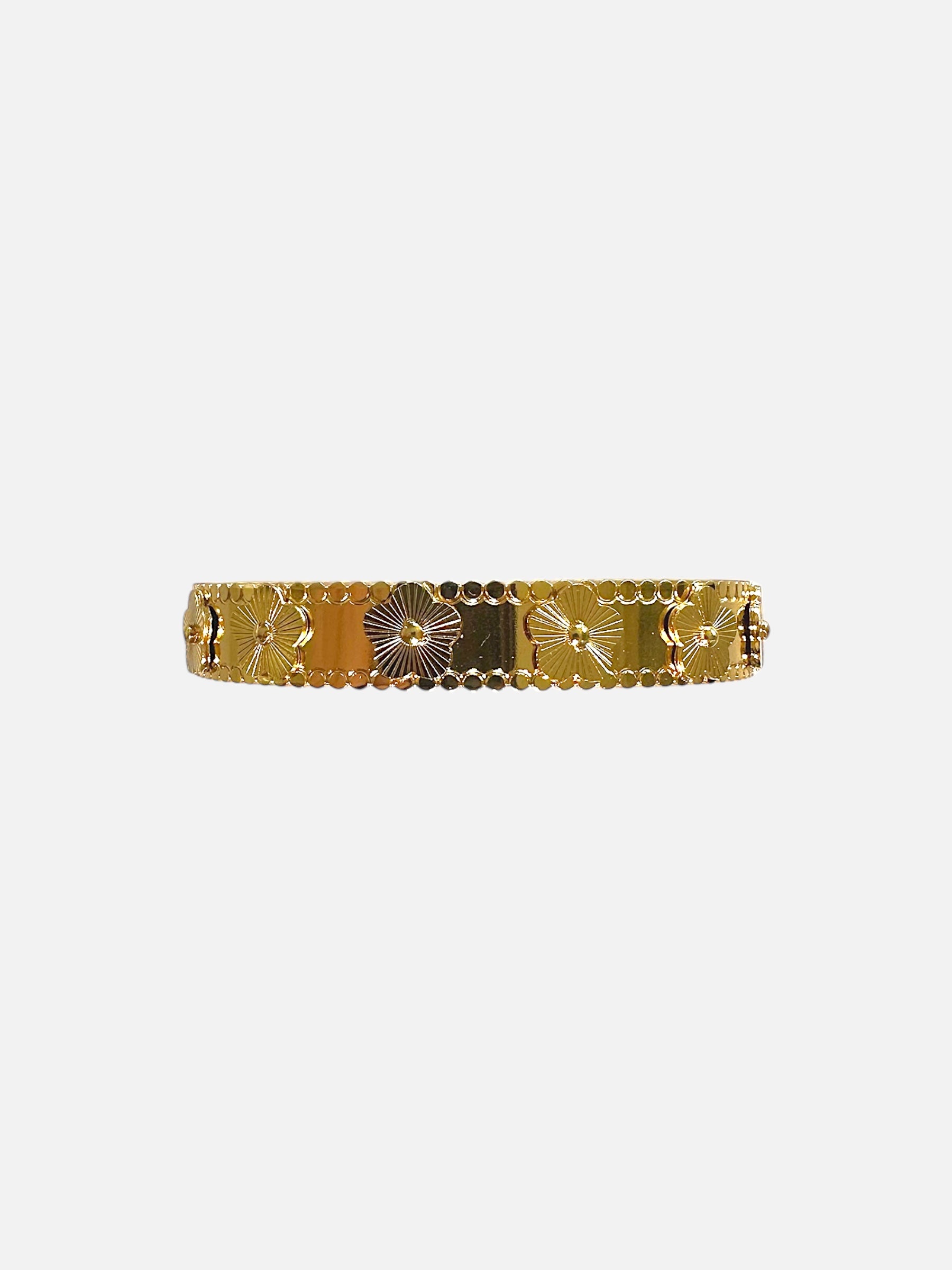 Le bracelet "Éclat Floral" incarne l'élégance intemporelle avec son design raffiné et délicatement orné de motifs floraux. Son jonc doré, finement gravé et agrémenté de détails subtils, apporte une touche sophistiquée et féminine à votre poignet. Ce bijou lumineux et poétique est parfait pour sublimer vos tenues avec finesse.
