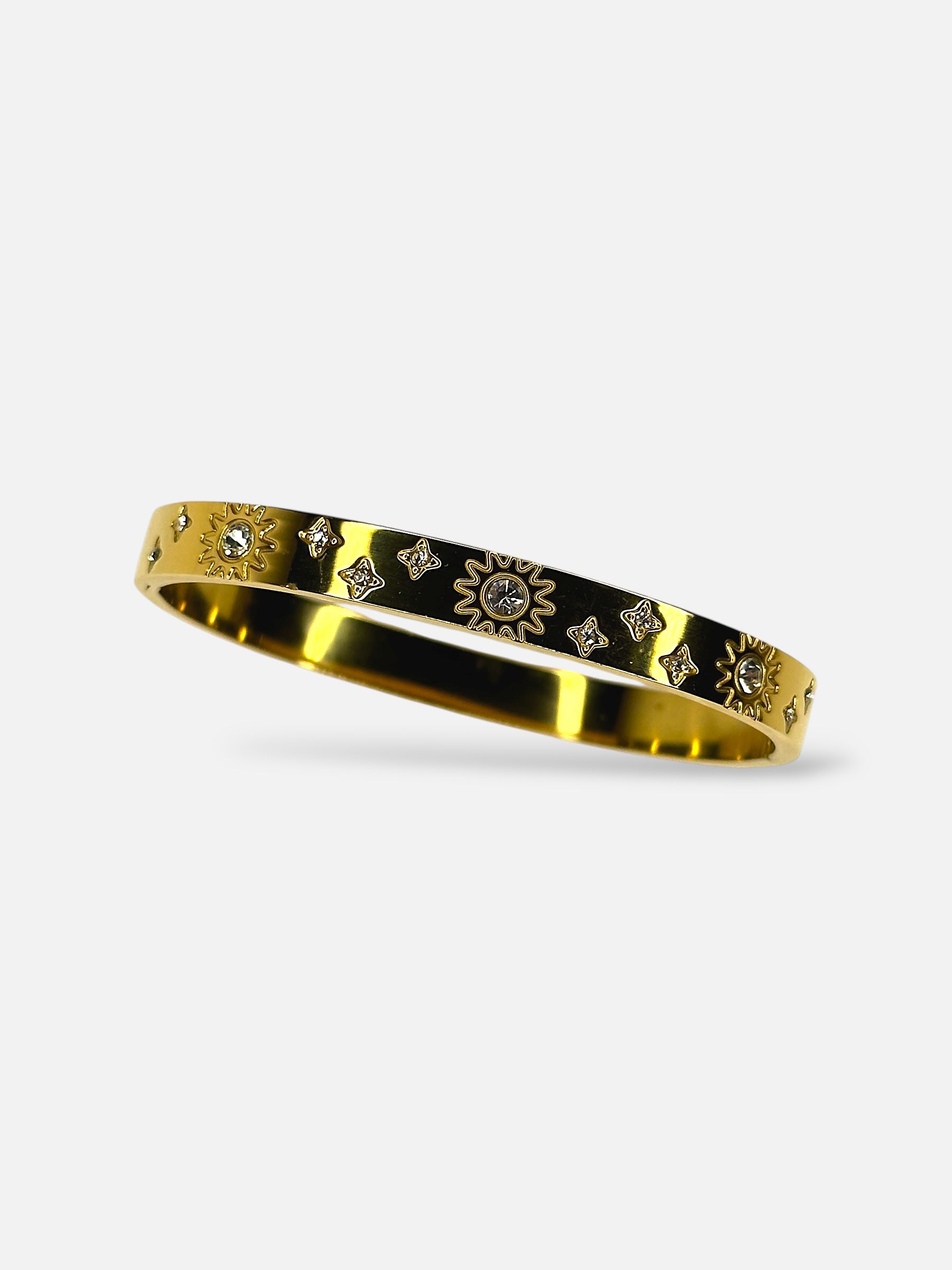 Le bracelet "Solar Shine" incarne une fusion parfaite entre l'élégance du doré et l'éclat des détails ensoleillés. Avec ses motifs de soleil et ses pierres scintillantes, il apportera à votre poignet une touche rayonnante et moderne.