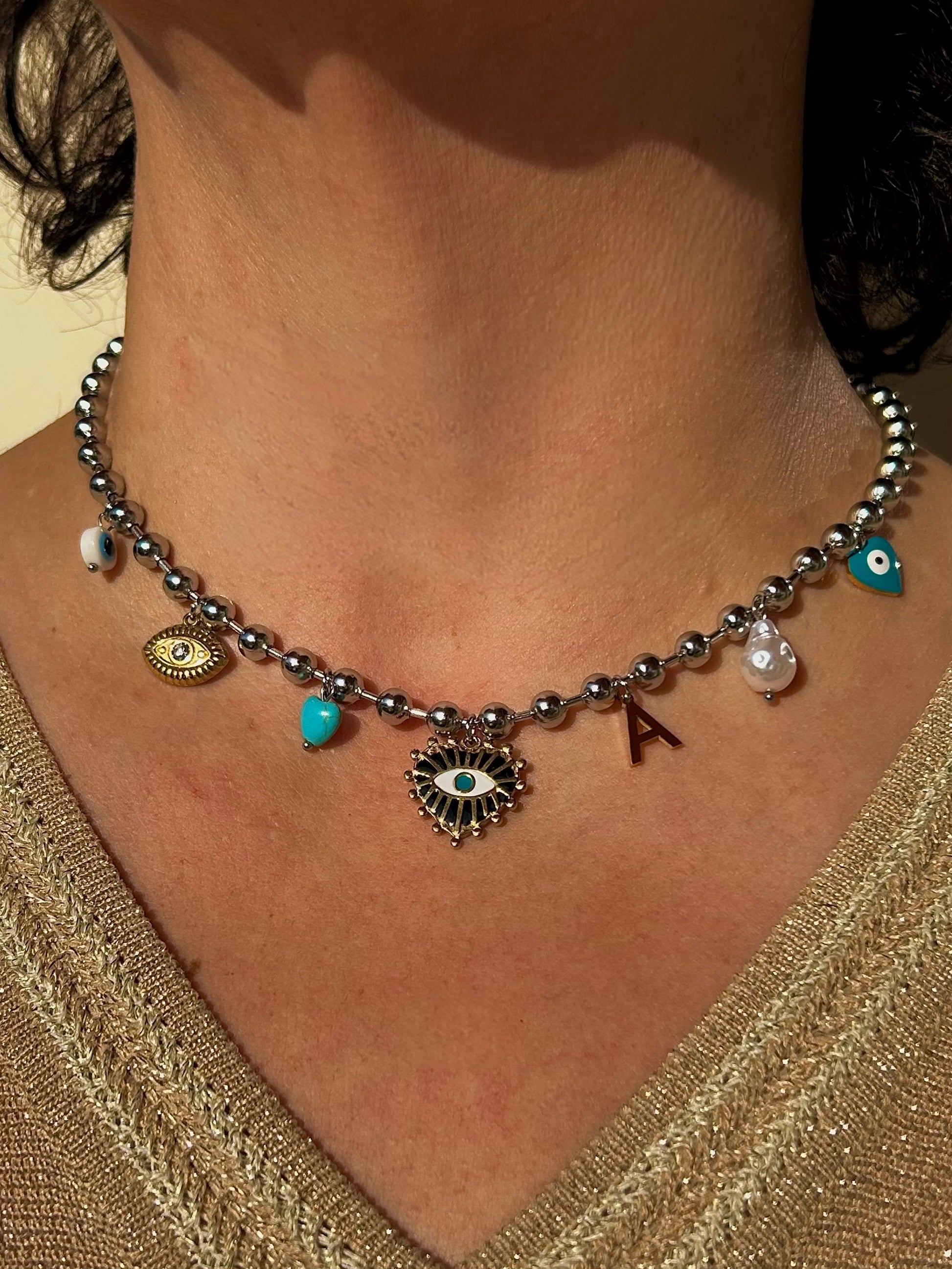 Portez la protection avec style grâce au collier "Astreya", une création vibrante et mystique inspirée des talismans du monde. Ses charms en forme d’œil, de gouttes colorées et de lettre sont bien plus que de simples ornements : ils racontent une histoire, celle de la lumière qui veille.