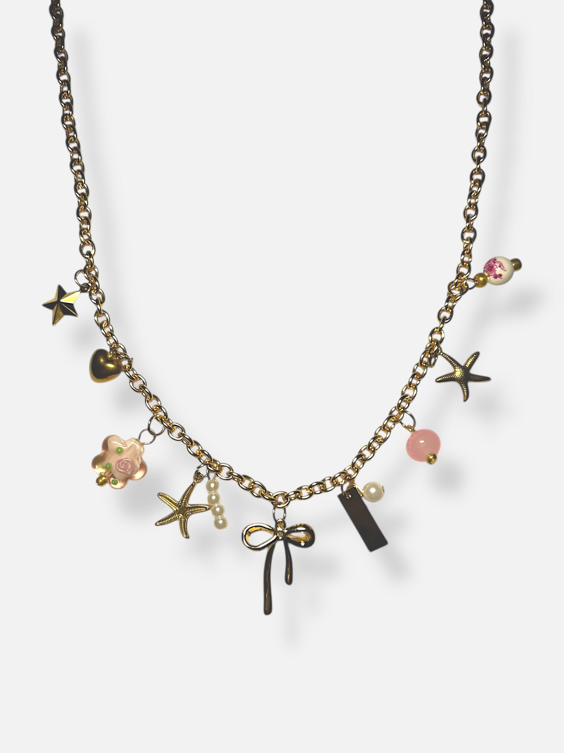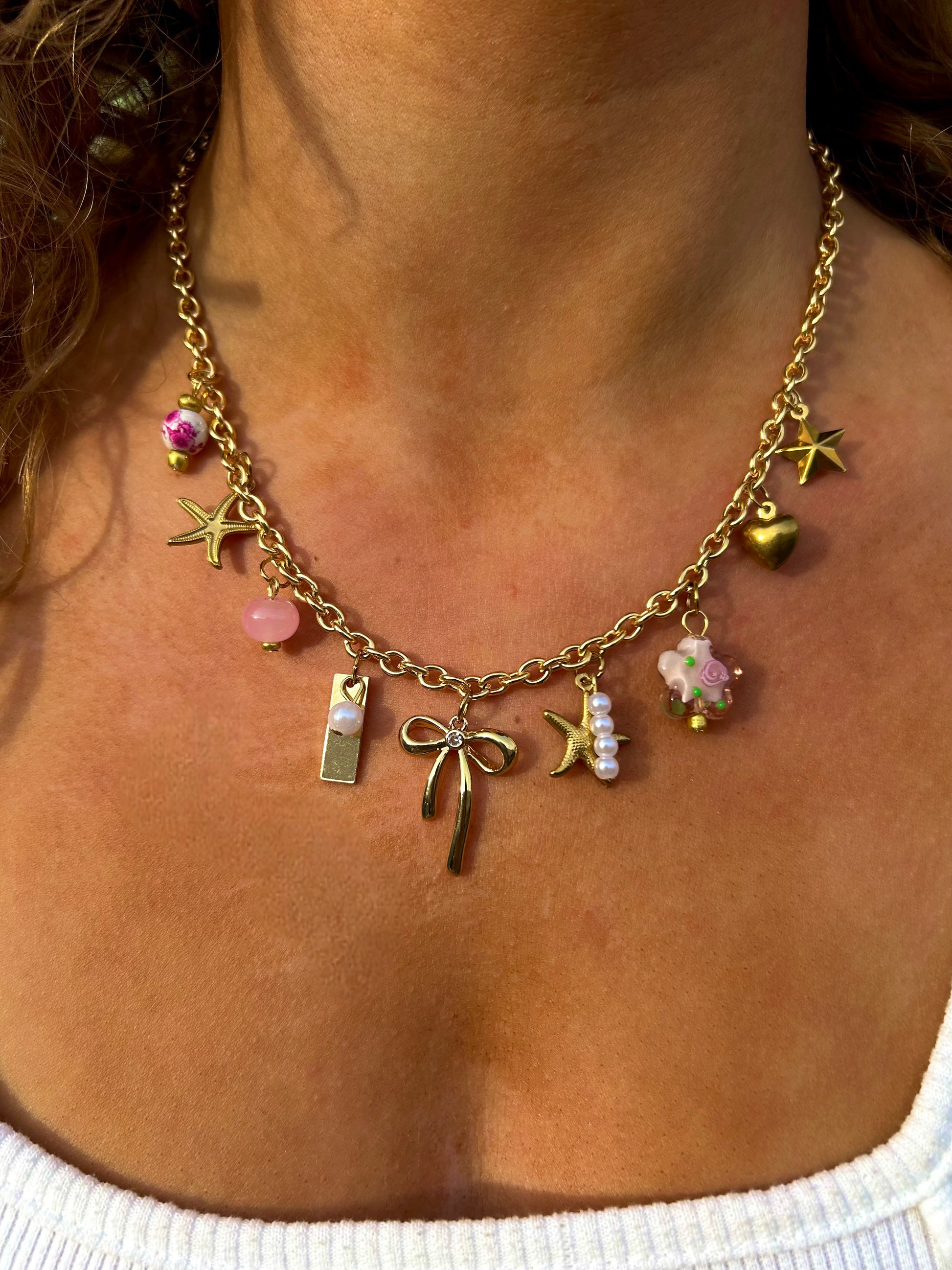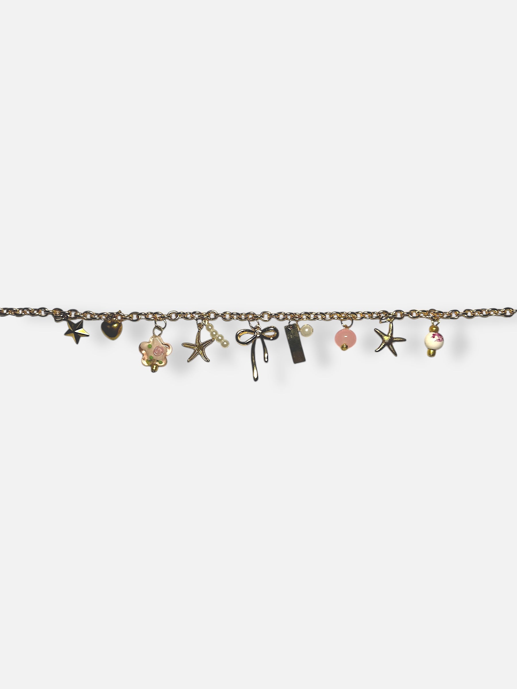 Design : Breloques variées, incluant des étoiles, un nœud, des fleurs et des perles délicates