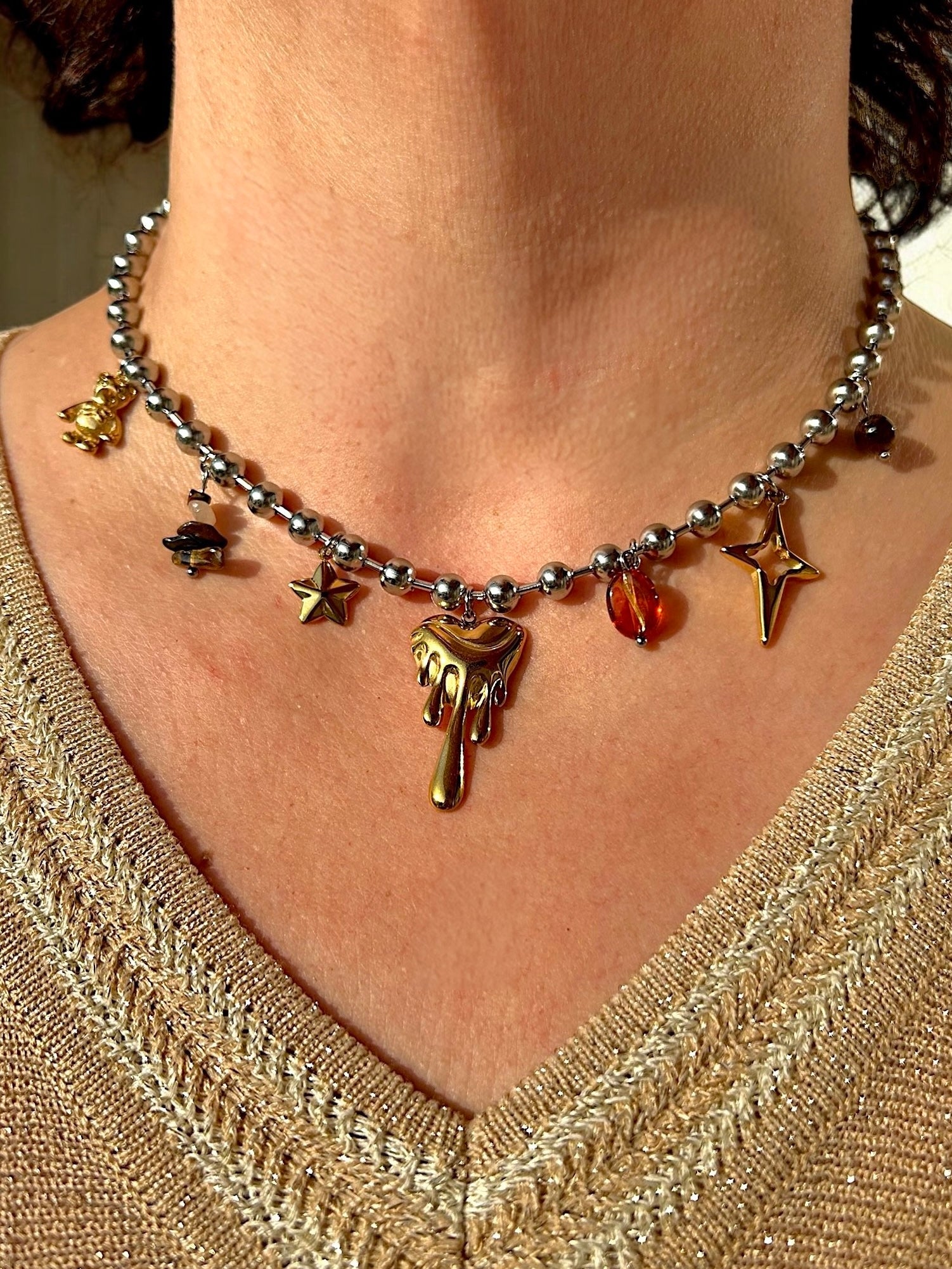 Osez l’audace artistique avec le collier "Lova", une pièce décalée et expressive qui fusionne le fun et le désir. Son pendentif lèvres fondantes dorées capte l’attention, tandis que les charms étoile, perles et gouttes ajoutent un twist cosmique à l’ensemble.