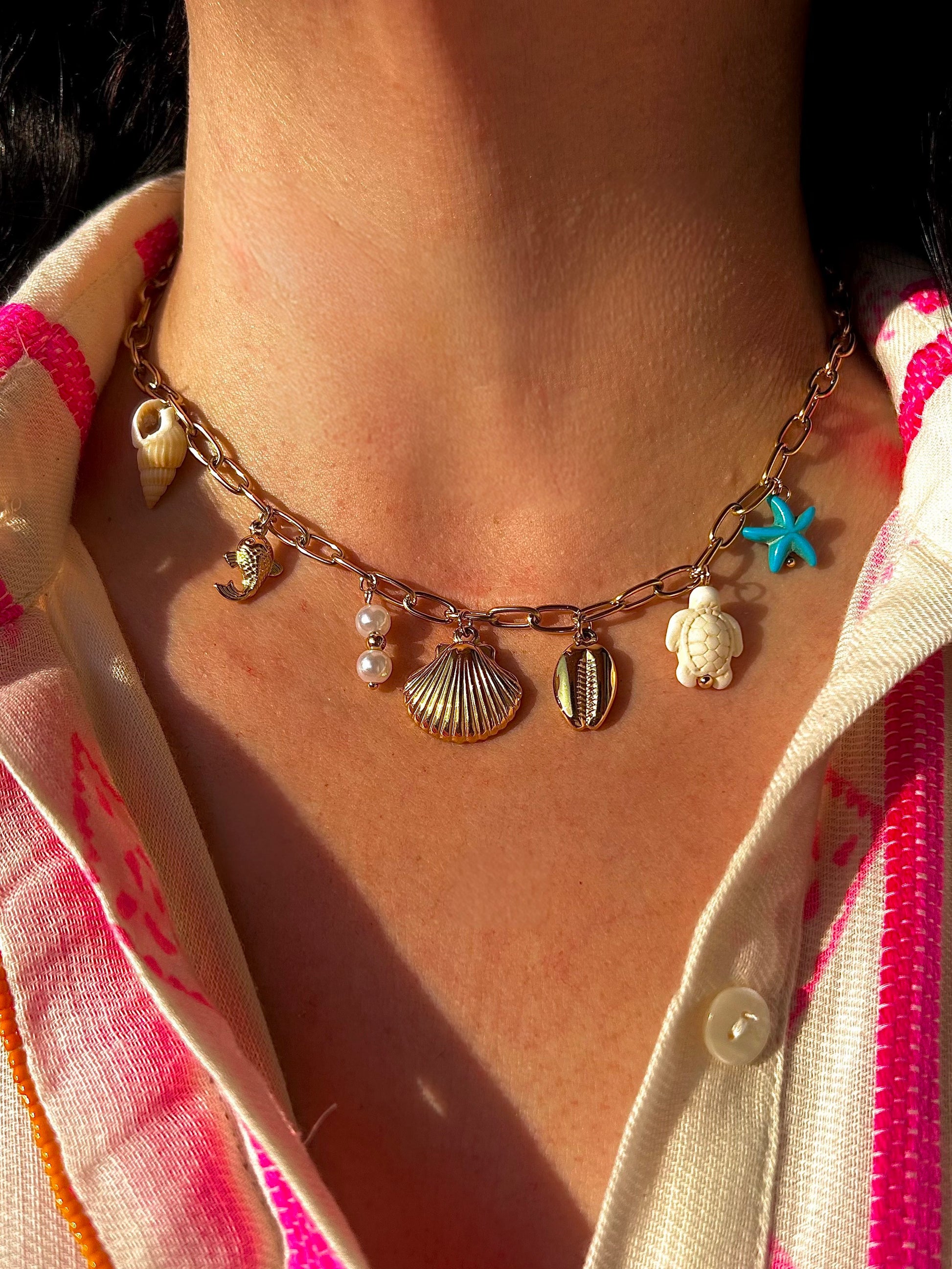 Design : Maillons dorés agrémentés de charms marins (coquillage, tortue, étoile de mer, perles…)