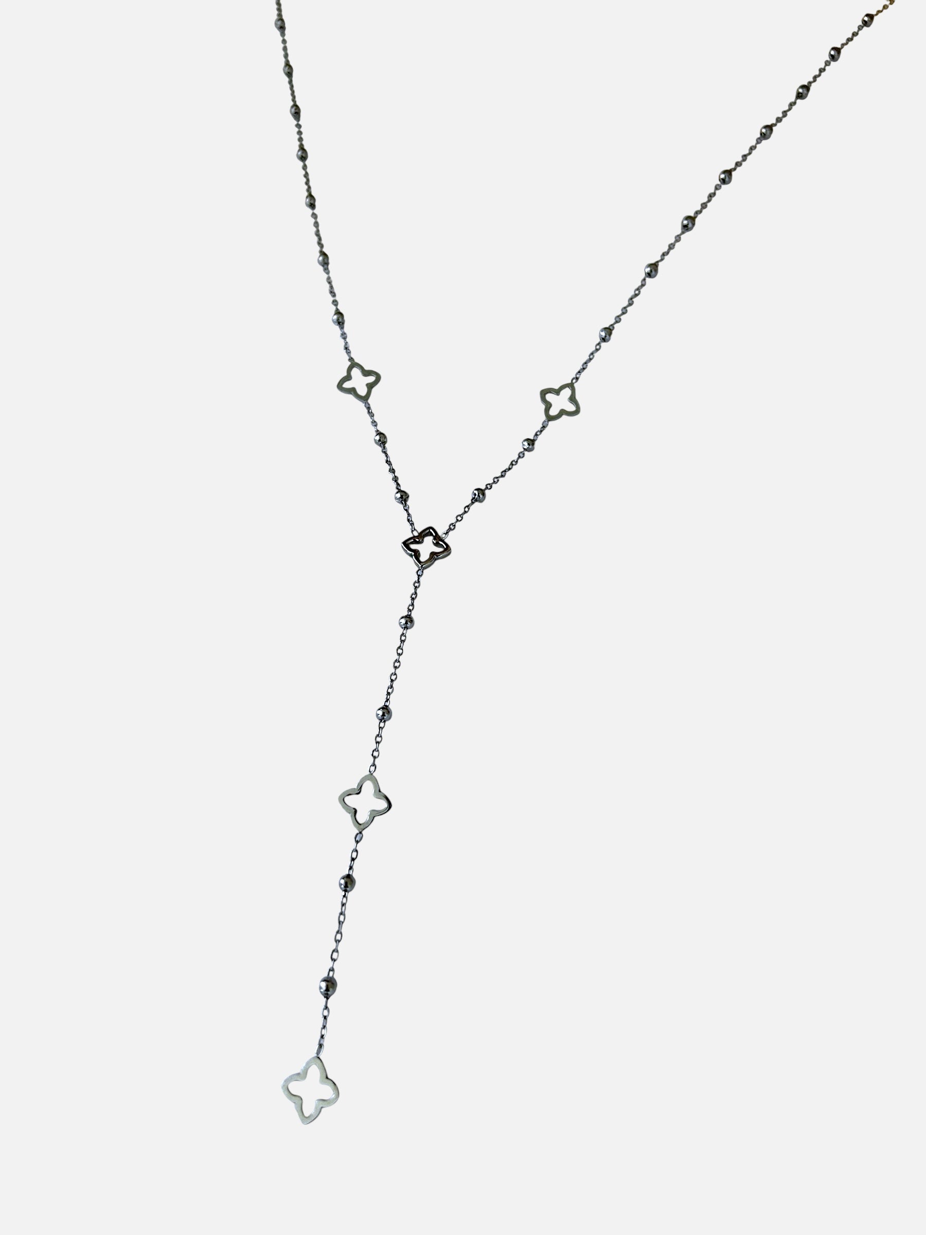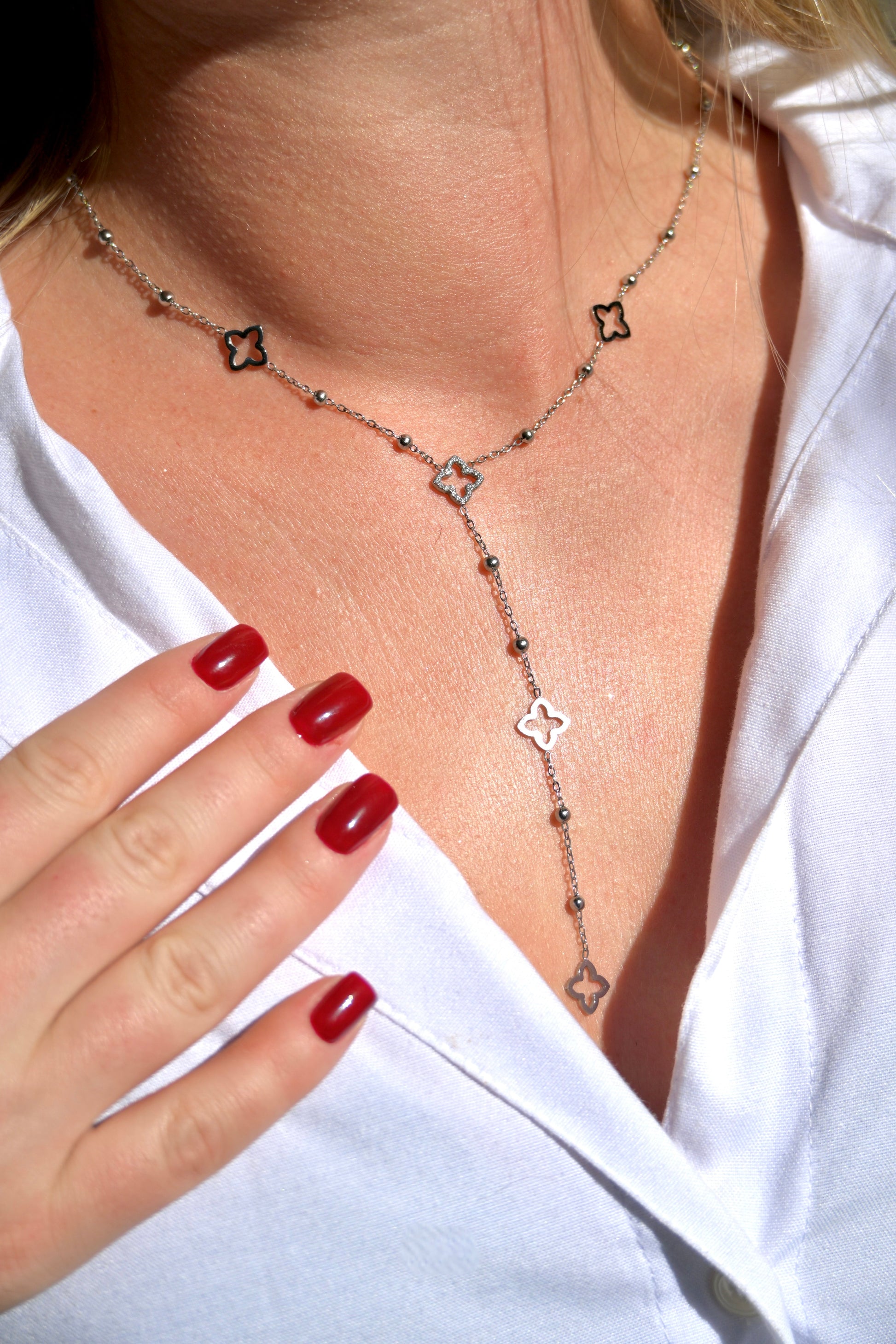 Raffiné et délicat, le collier "Midnight" allie minimalisme et détails subtils. Son acier noir brillant, ponctué de perles et de motifs ajourés en forme de croix florale, crée un tombé élégant et graphique. Parfait pour habiller un décolleté avec discrétion et modernité.