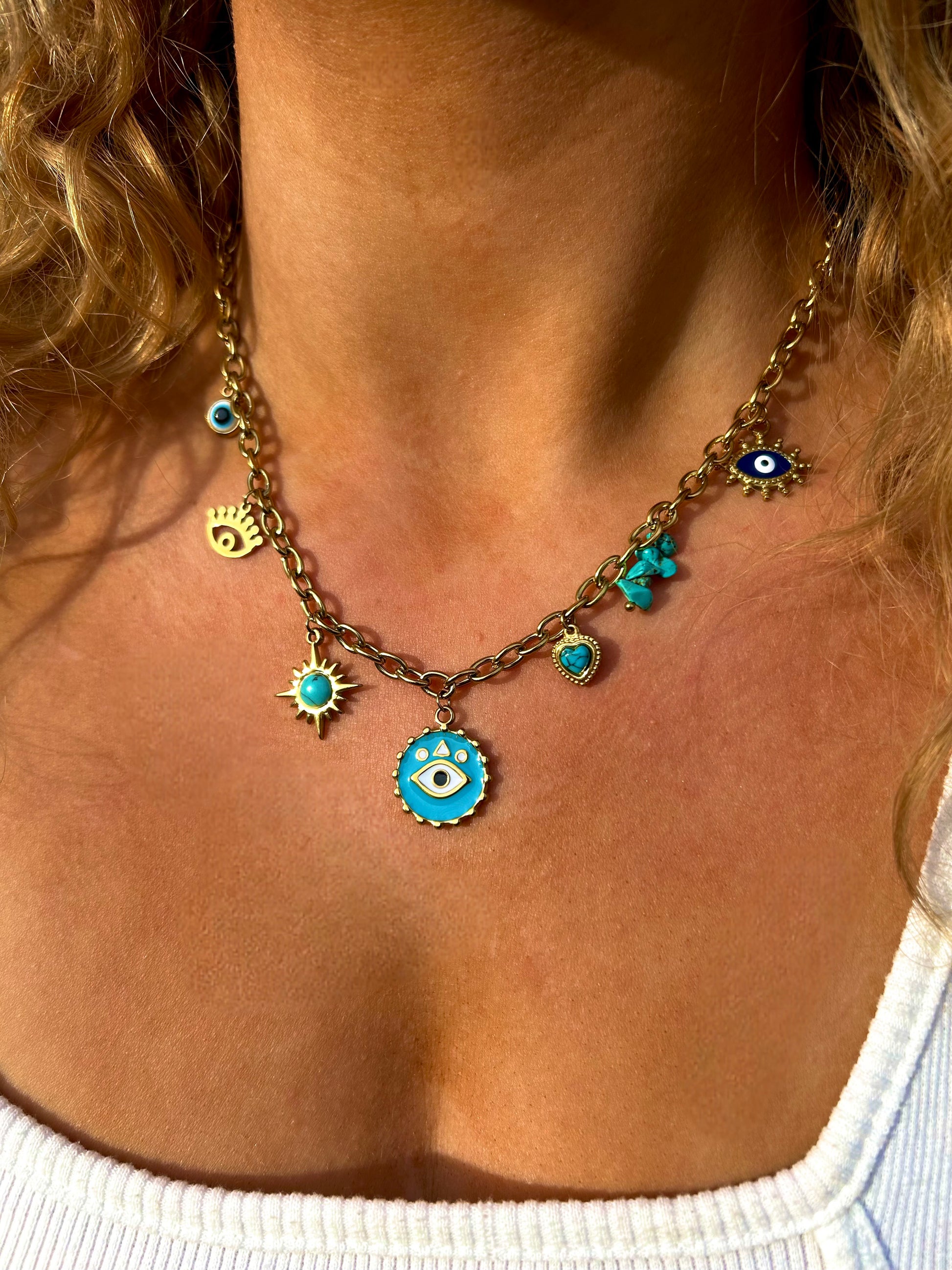 Design : Breloques mystiques, incluant des yeux protecteurs, un cœur turquoise, des soleils et des pierres naturelles