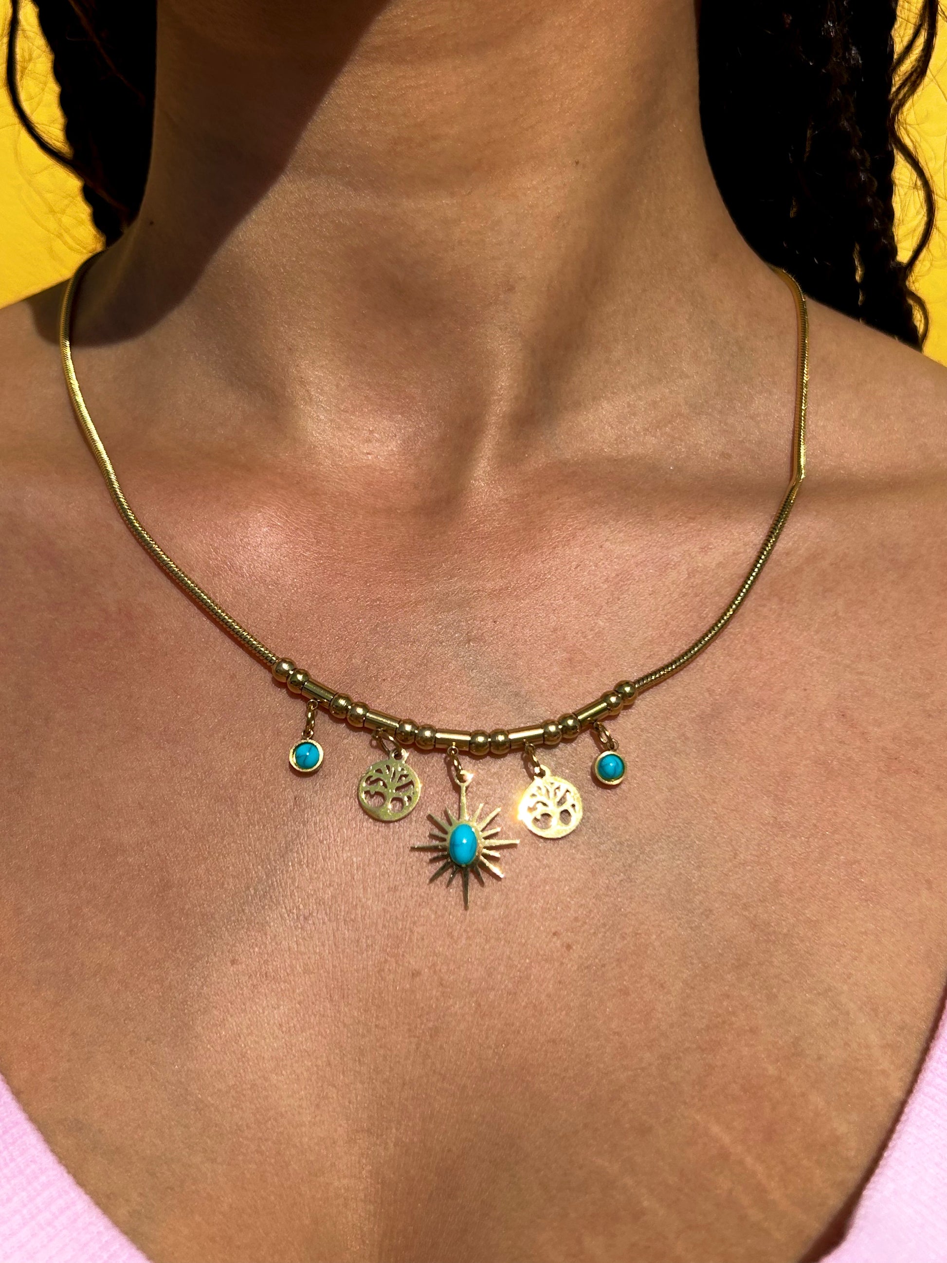Le collier "Mystiques Turquoises" fusionne élégance et protection avec ses breloques inspirées de symboles mystiques et apaisants. Suspendues à une chaîne en acier inoxydable doré, les breloques incluent des yeux protecteurs, des soleils turquoise éclatants, un cœur délicat, et des pierres naturelles. Chaque détail apporte une énergie positive et une touche sophistiquée à vos tenues.